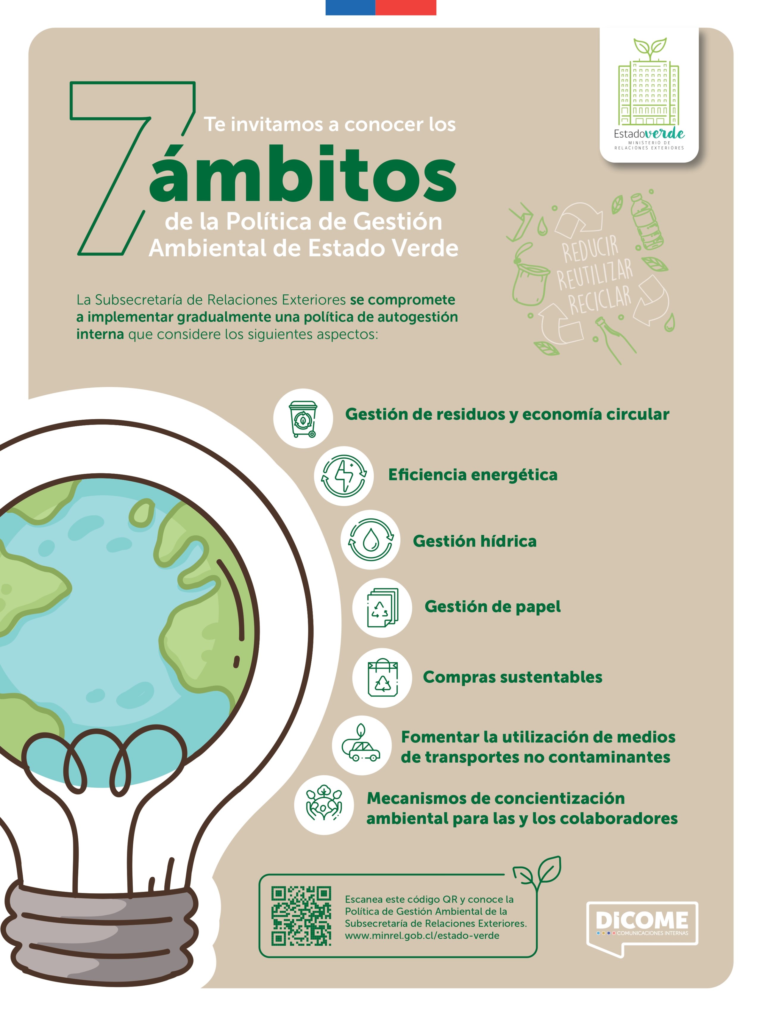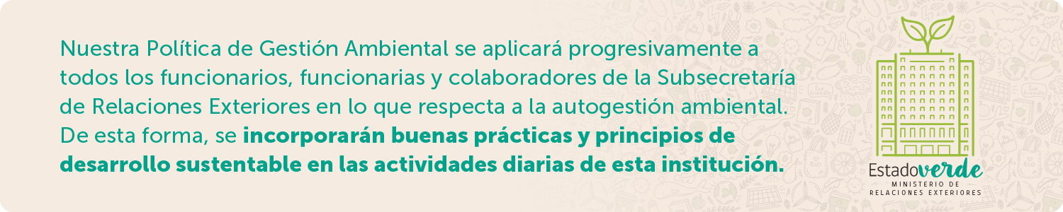 El documento ha sido elaborado como parte de las acciones orientadas al cumplimiento del Plan de Gestión Ambiental 2025 de esta Secretaría de Estado y a la implementación gradual de la Política de Gestión Ambiental de la Subsecretaria de Relaciones Exteriores, que contempla aspectos tales como; gestión de residuos y economía circular, eficiencia energética, gestión hídrica, gestión de papel, compras sustentables, transporte y mecanismos de concientización ambiental para las y los colaboradores.
