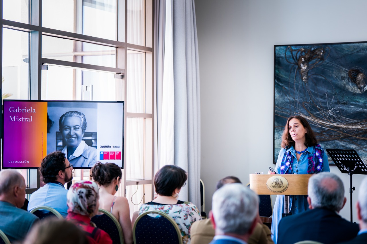 La Ministra de Relaciones Exteriores, Antonia Urrejola, presentó la edición conmemorativa por el centenario del libro “Desolación” de Gabriela Mistral que integra la colección “Diplomacia y Letras”. En el evento, además, participó la Ministra de las Culturas, las Artes y el Patrimonio, Julieta Brodsky; la Subsecretaria del Patrimonio Cultural, Carolina Pérez; la Subsecretaria de las Culturas, Andrea Gutiérrez, y el Director de la Biblioteca Nacional, Pedro Pablo Zegers.