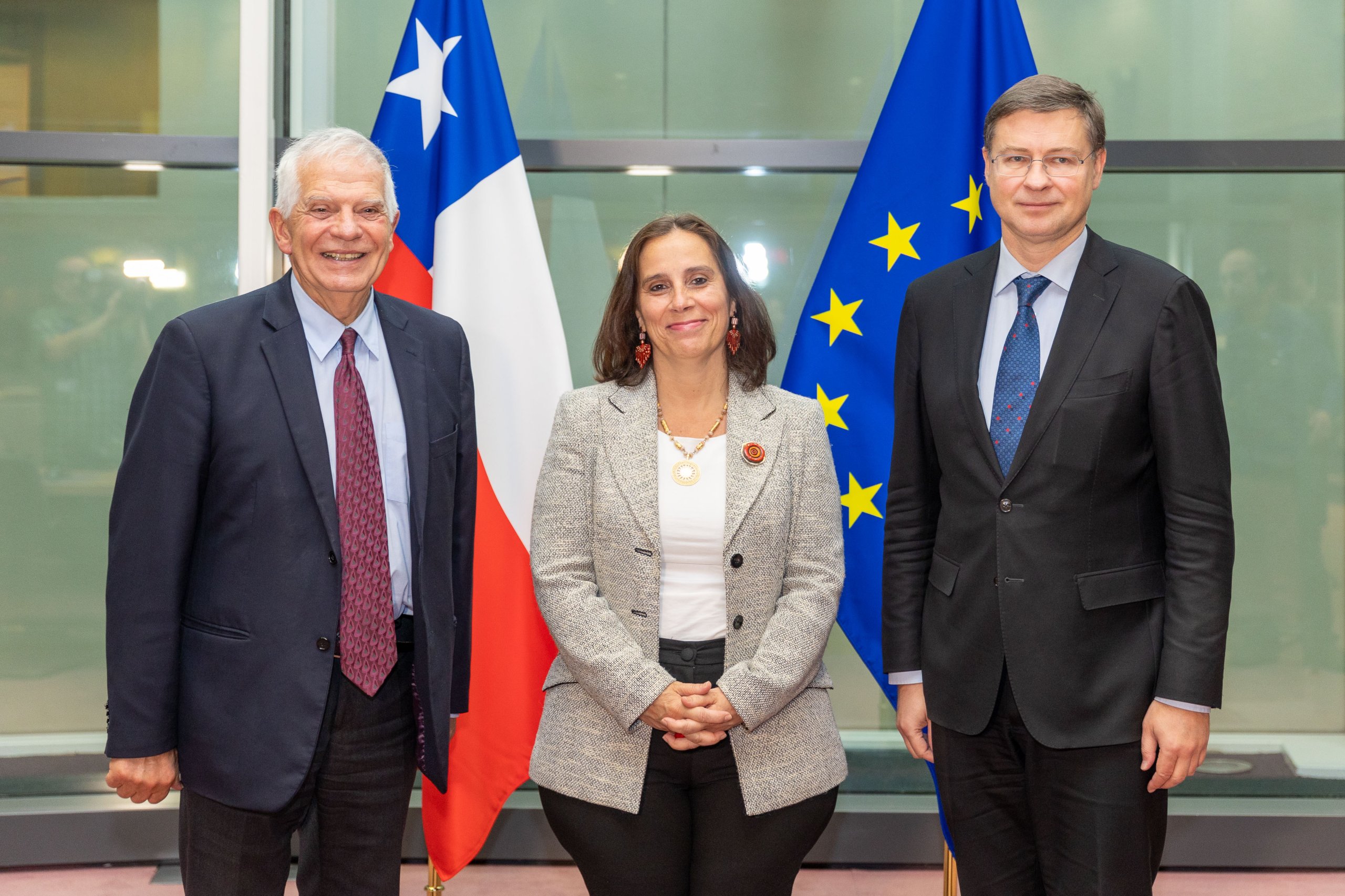 La Ministra de Relaciones Exteriores, Antonia Urrejola. y el Subsecretario de Relaciones Económicas Internacionales, José Miguel Ahumada; junto al Alto Representante de la Unión para Asuntos Exteriores y Política de Seguridad y Vicepresidente de la Comisión Europea, Josep Borrell, y al Vicepresidente Ejecutivo de la Comisión Europea para el Euro y del Diálogo Social y Comisario de Comercio, Valdis Dombrovskis, anunciaron hoy que alcanzaron un acuerdo en principio para el nuevo Acuerdo Marco Avanzado entre Chile y la Unión Europea.