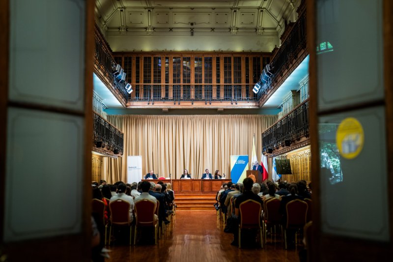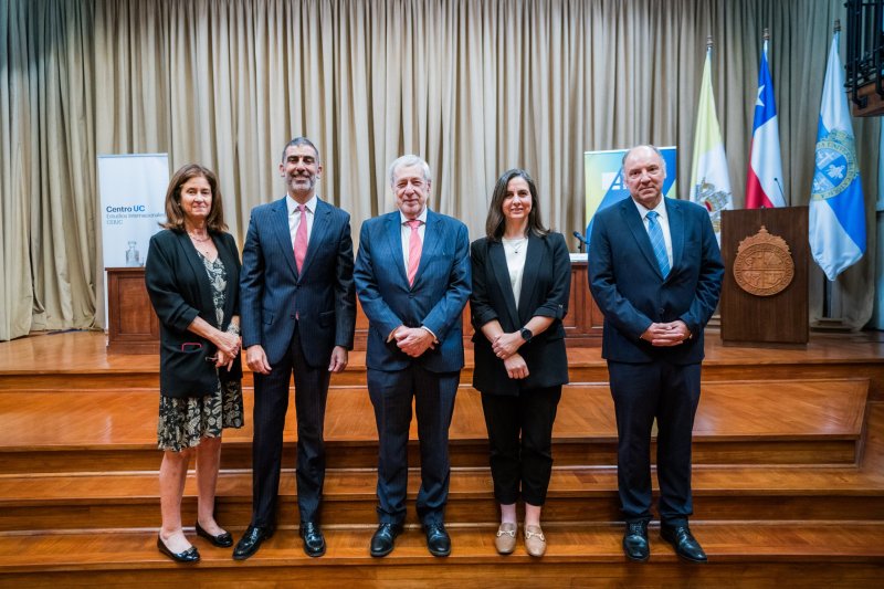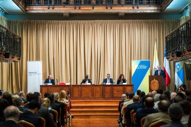 El ministro de Relaciones Exteriores, Alberto van Klaveren, dictó una clase magistral sobre los desafíos de la política exterior de Chile en un encuentro organizado por el Centro de Estudios Internacionales UC y la Fundación Konrad Adenauer, que se llevó a cabo en el Aula Magna Manuel José Irarrázaval de la Casa Central de la Pontifica Universidad Católica.